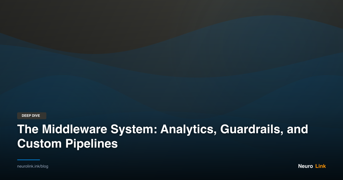 This tutorial walks through the lifecycle middleware from the ground up. You will learn how NeuroLink chains middleware, how each hook fires during generation and streaming, and how to compose hooks for logging, analytics, error recovery, and real-time monitoring. By the end, you will have a production-ready cost tracker running as lifecycle middleware.